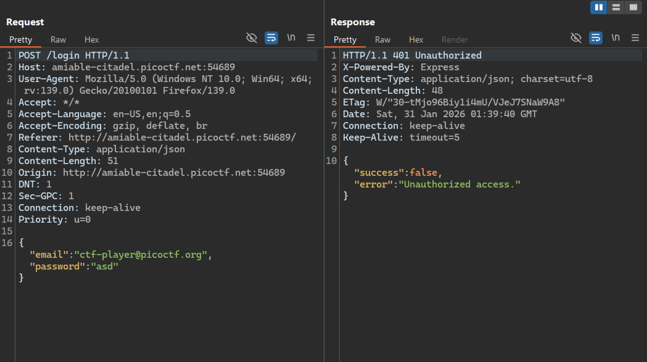 To exploit this, I enabled Burp Suite’s proxy and sent a login request with an arbitrary password: