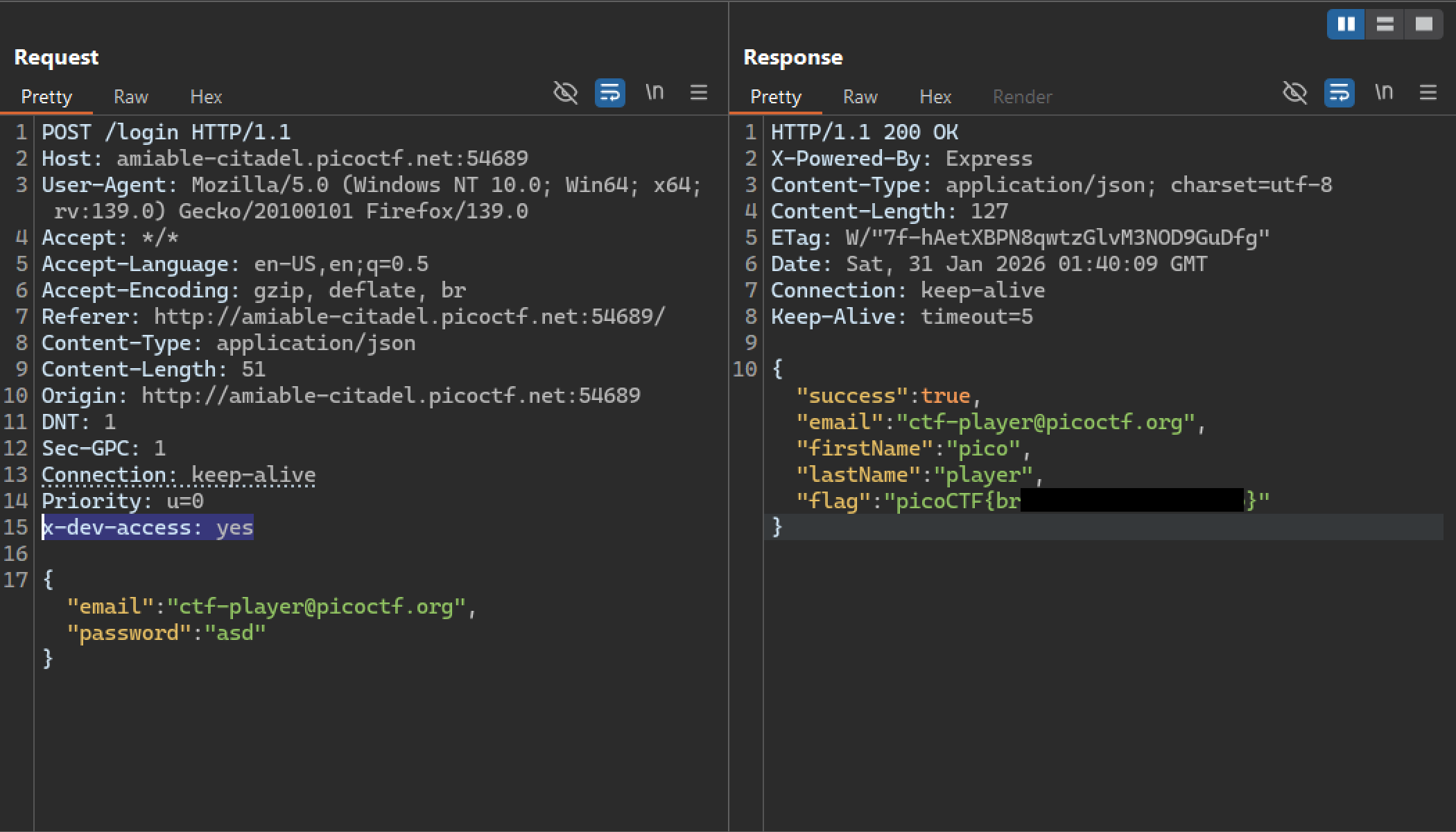 Then I sent the modified request again. This successfully bypassed authentication and revealed the flag: